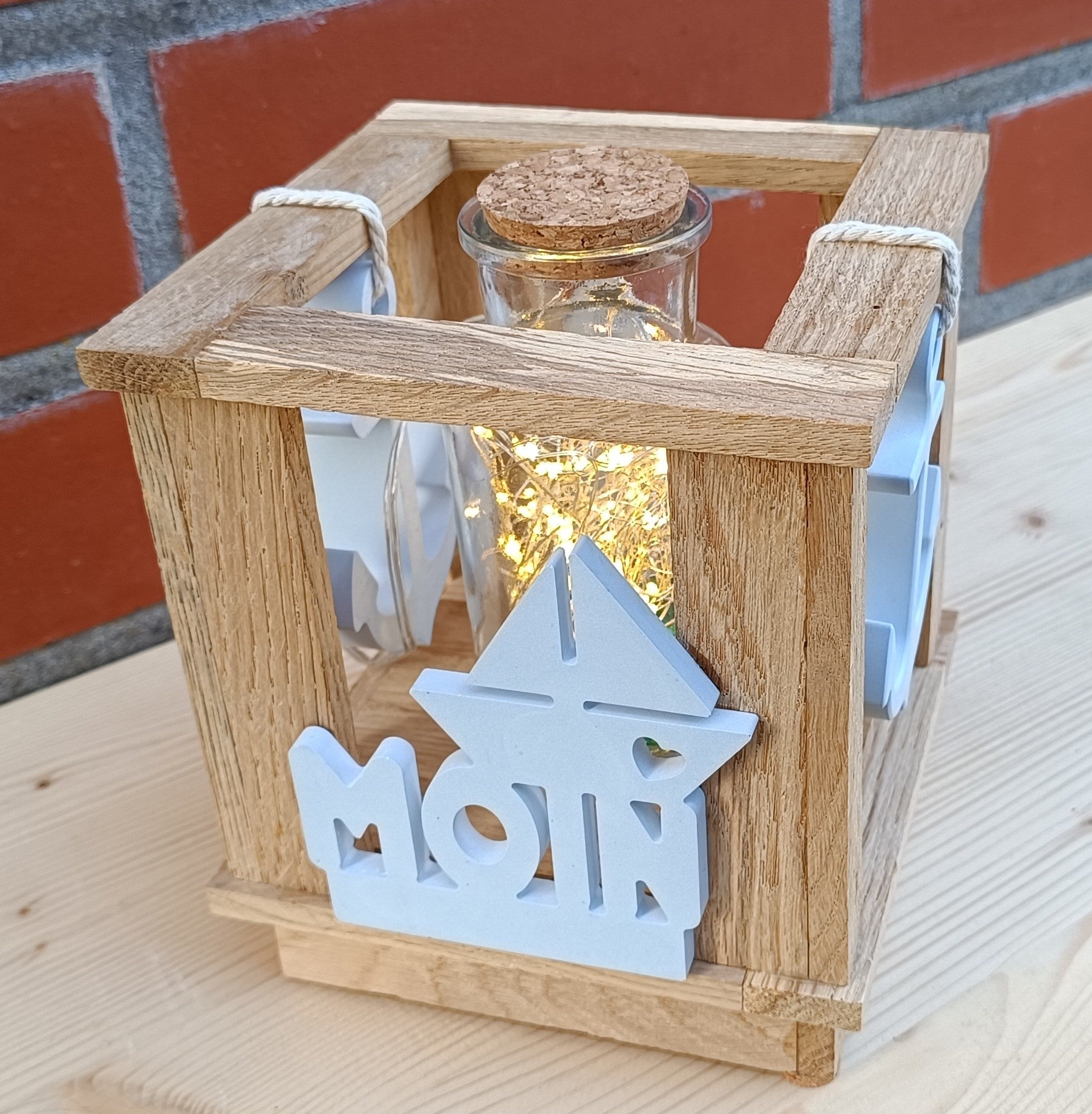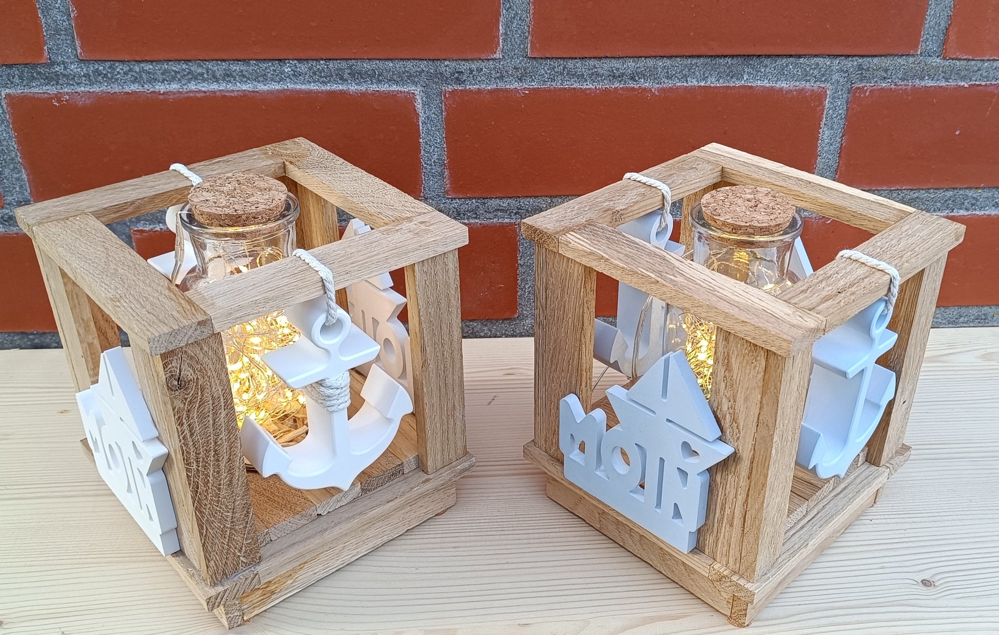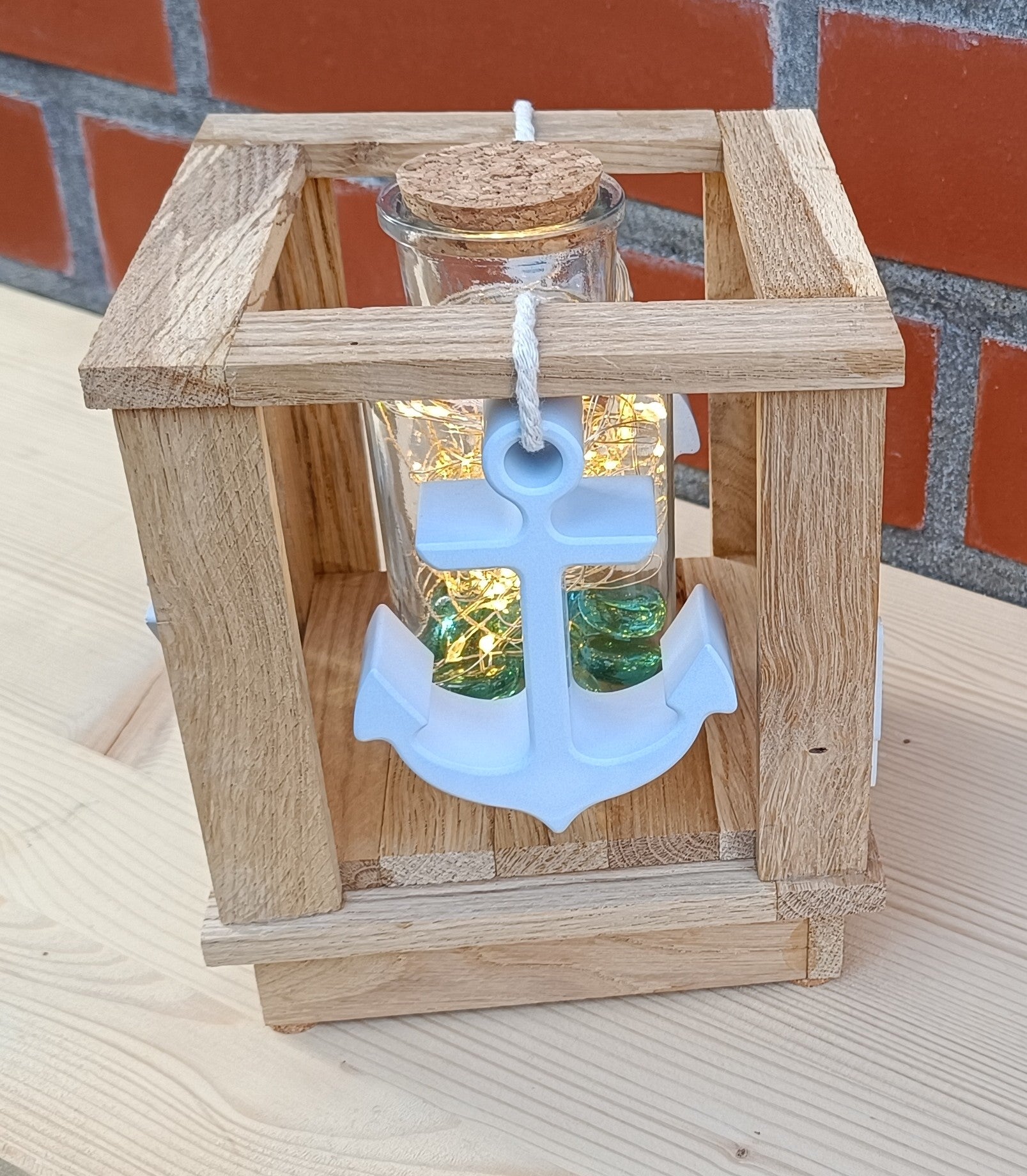 Verschönern Sie Ihr Zuhause mit der handgefertigten Dekoleuchte aus Holz mit dem trendigen Schriftzug "Moin" und einem Anker auf jeder Seite. Mit der mitgelieferten LED-Lichterkette im Glasgefäss sorgt die Leuchte für eine angenehme und stimmungsvolle Atmosphäre. Perfekt für jeden Küsten-Liebhaber!