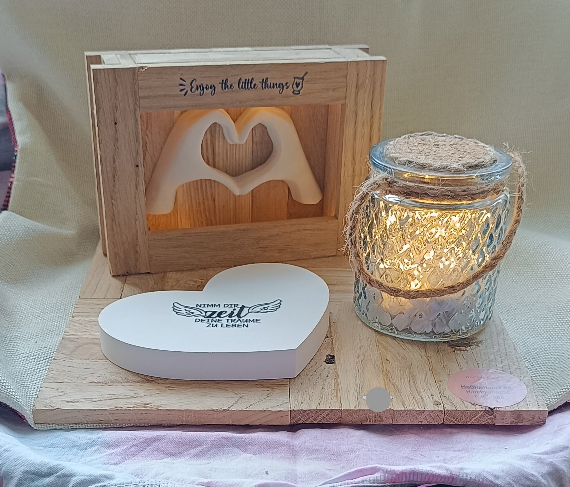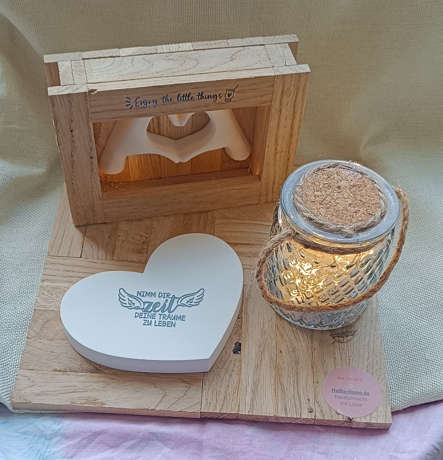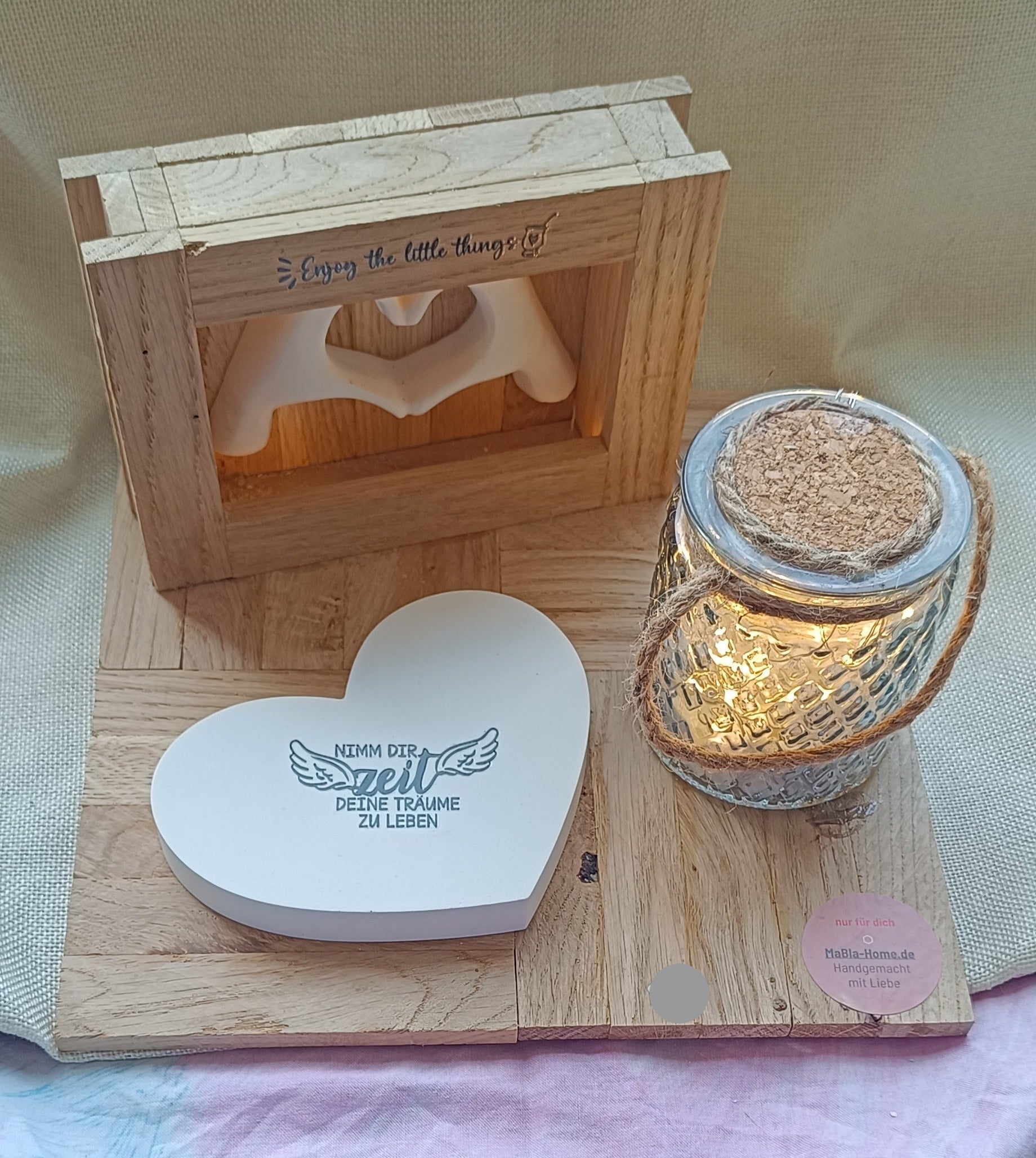 Das Dekotablett „mit Hand und Herz“ bringt nicht nur Licht ins Dunkel, sondern auch Schwung in deinen Alltag. Mit seiner liebevollen Gestaltung und sanfter Beleuchtung motiviert es dich spielerisch, jeden Moment mit Freude zu genießen. Ideal, um deinem Zuhause eine fröhliche Note zu verleihen!
