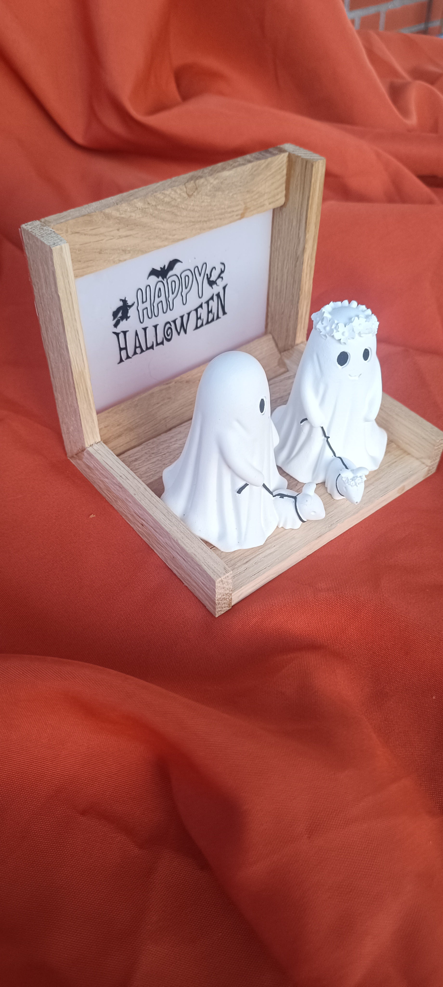 Willkommen zu unserem gruseligen Geisterpärchen mit Hund – das perfekte Halloween-Accessoire für alle, die es liebevoll spooky mögen! Dieses charmante Pärchen besteht aus detaillierten Keramik-Gussfiguren, die in einem eleganten Holzrahmen mit transparenter Rückwand präsentiert werden. Die aufgetragene Beschriftung verleiht dem Ganzen den letzten Schliff. Ideal zum Aufstellen auf dem Regal, der Kommode oder als Wanddeko – dieses Stück bringt garantiert ein Lächeln ins Gesicht und setzt ein verspieltes Statement in Ihrer Herbstdeko. Ein Must-have für Halloween-Fans!