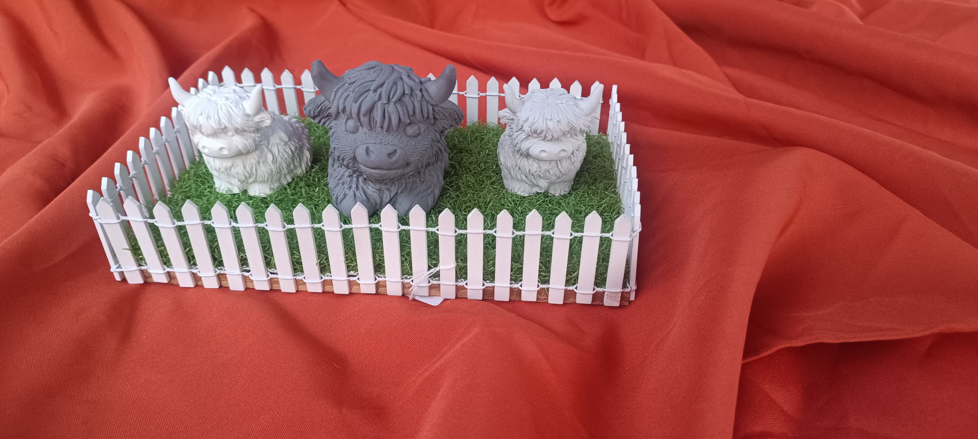 Drei glückliche Rinder und ein umzäuntes Gehege! Mit weißem Zaun und großzügigem Platz können deine Rinder frei grasen, spielen und die Sonne genießen. Perfekt für kleine Hobby-Züchter, die ihren Tieren ein sicheres, grünes Paradies bieten möchten.