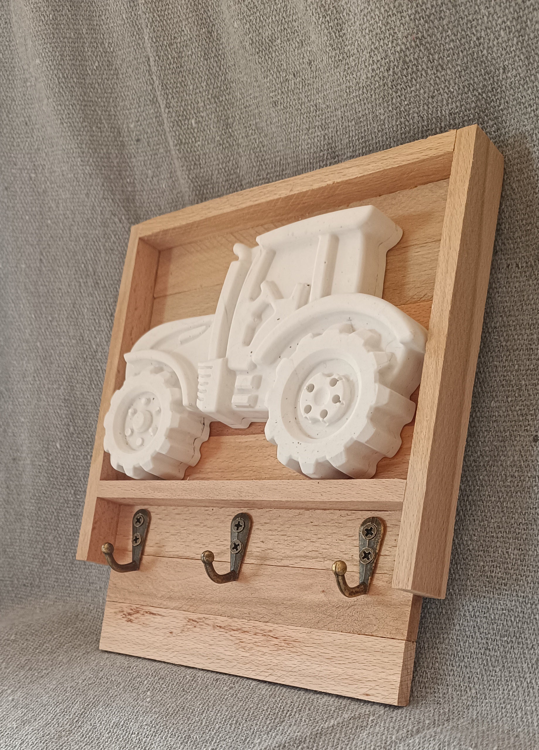 Das Schlüsselbrett "Trecker" kombiniert rustikales Holz mit robuster Keramik-Gußmasse und bringt mit seinen vier Metall-Schlüsselaufhängern spielerischen Landhauscharme in jeden Flur. Hier finden Ihre Schlüssel ihren festen Platz – praktisch, dekorativ und mit einem Augenzwinkern!
