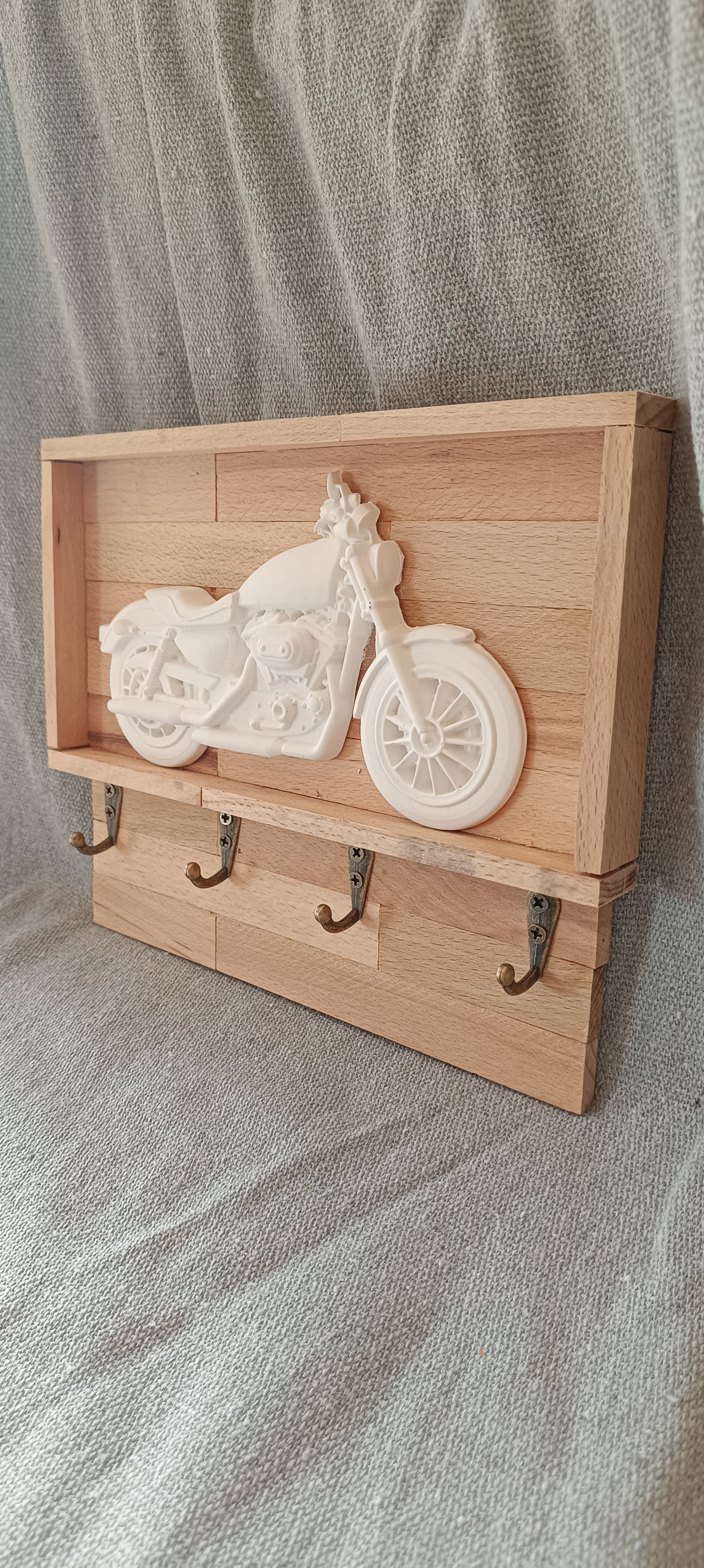 Das Schlüsselbrett "Motorrad" kombiniert rustikales Holz mit robuster Keramik-Gußmasse und bringt mit seinen vier Metall-Schlüsselaufhängern spielerischen Landhauscharme in jeden Flur. Hier finden Ihre Schlüssel ihren festen Platz – praktisch, dekorativ und mit einem Augenzwinkern!