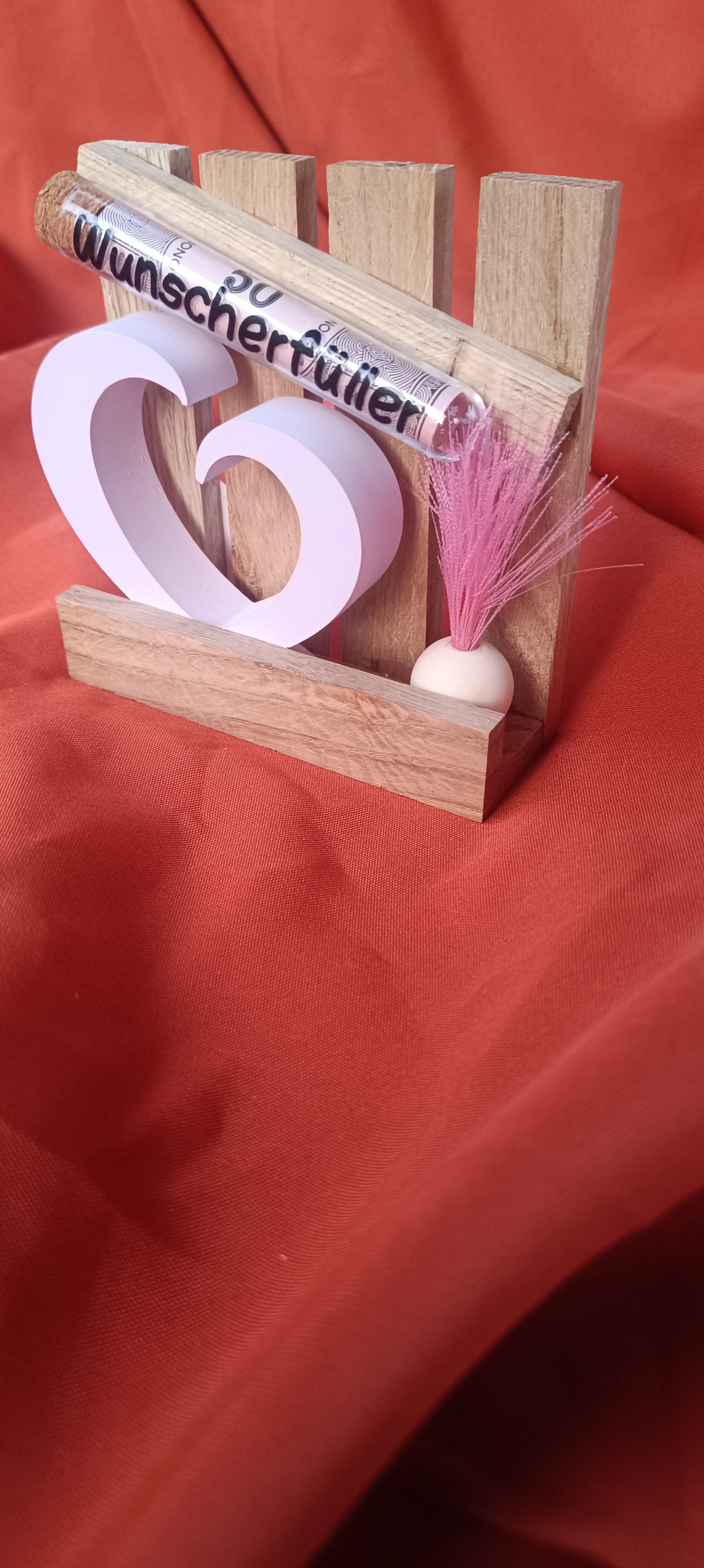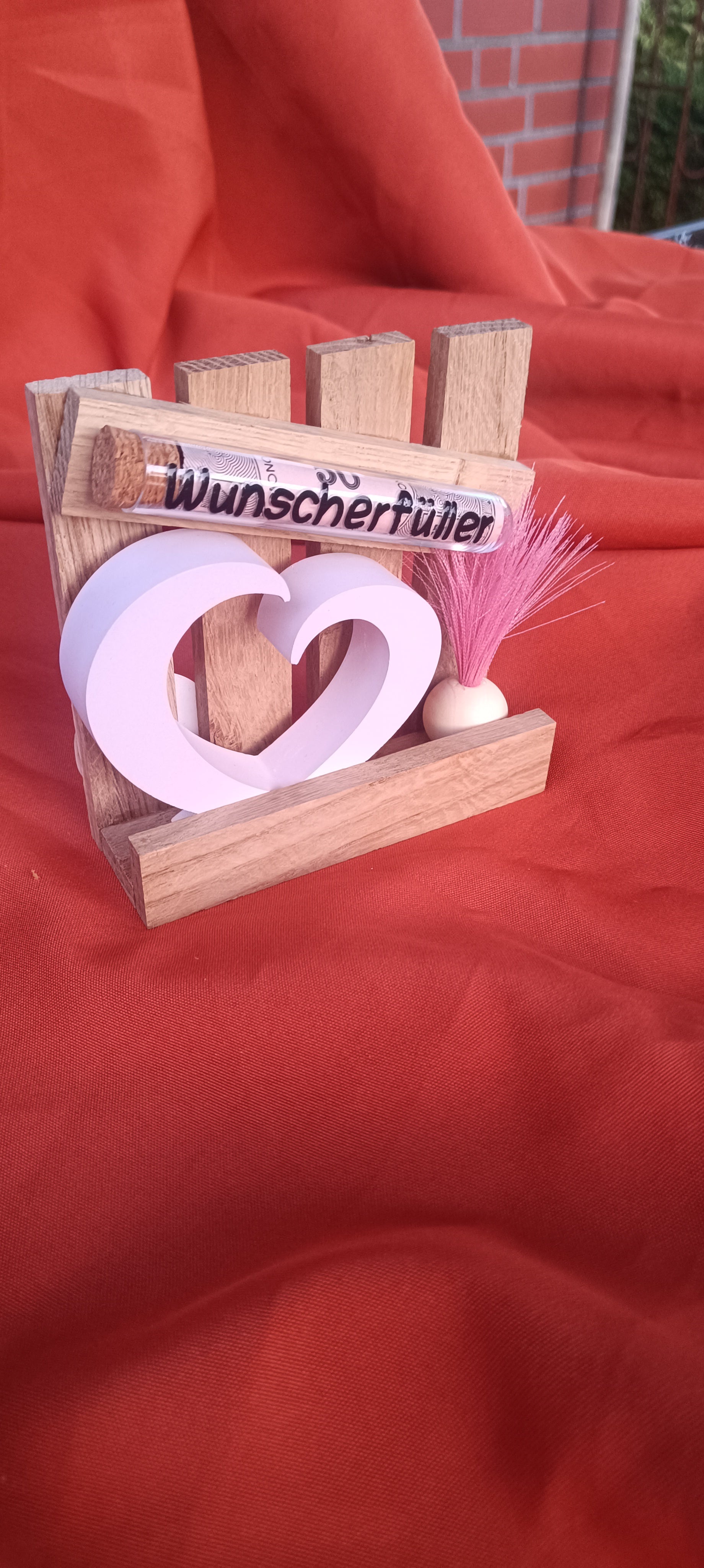 Das Wunscherfüller "Herzperle" verbindet die Wärme von Holz mit dem zauberhaften Touch eines Glasröhrchens – perfekt, um Geldgeschenke oder Gutscheine auf eine originelle und liebevolle Weise zu überreichen. Ideal für besondere Anlässe, bei denen kreative Überraschungen gefragt sind!
