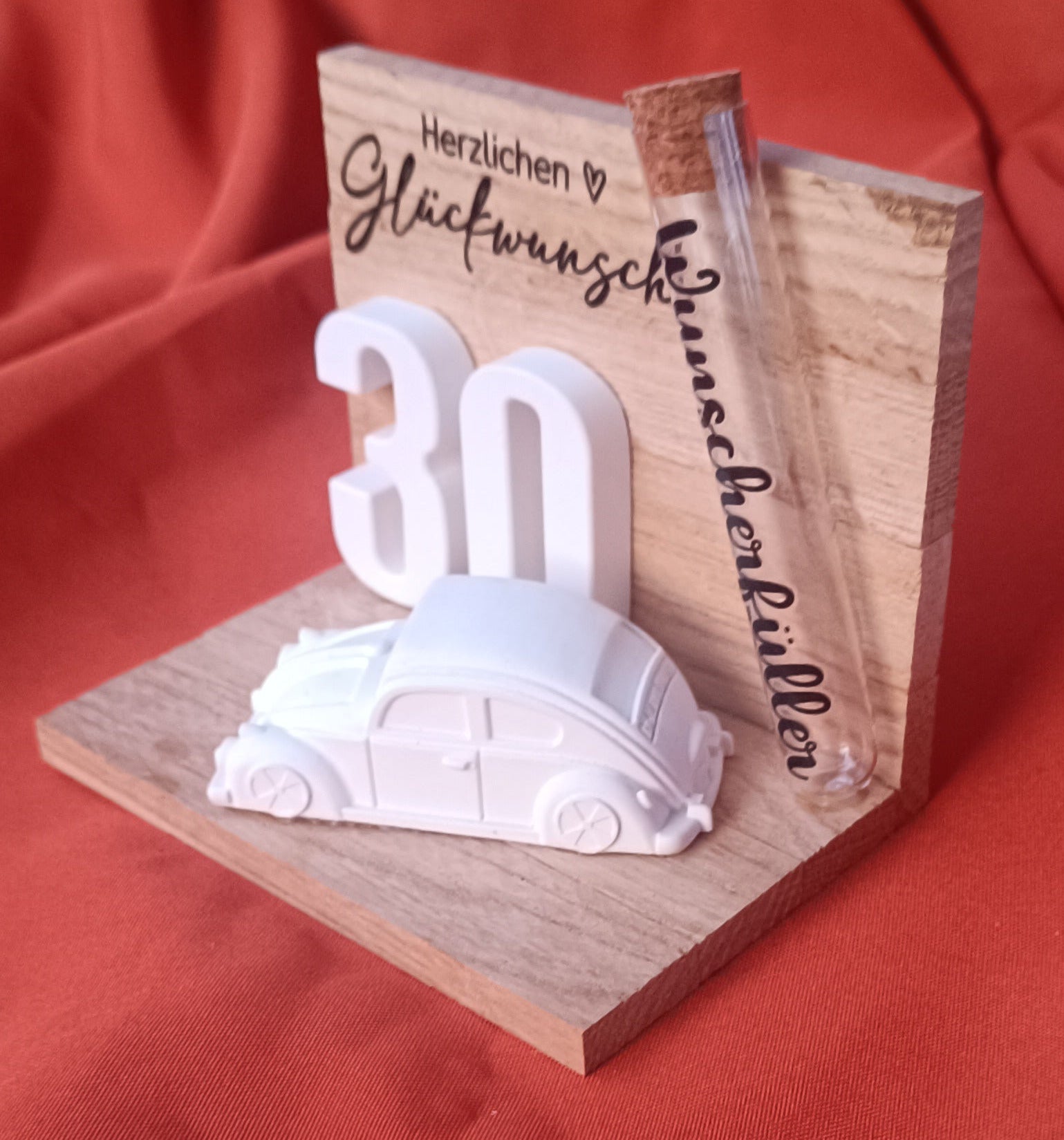 Geldgeschenke mal anders! Dieser niedliche VW-Käfer und das transparente Röhrchen verwandelt Geldscheine und Gutscheine in ein spielerisches Präsent. Ob zum Geburtstag, Jubiläum oder anderen Festtagen – das charmante Design sorgt für Lacher beim Auspacken und macht dein Geschenk zum absoluten Highlight. Ein witziger Weg, um Wünsche stilvoll zu erfüllen! Die Zahl kann auf Wunsch natürlich angepasst werden.